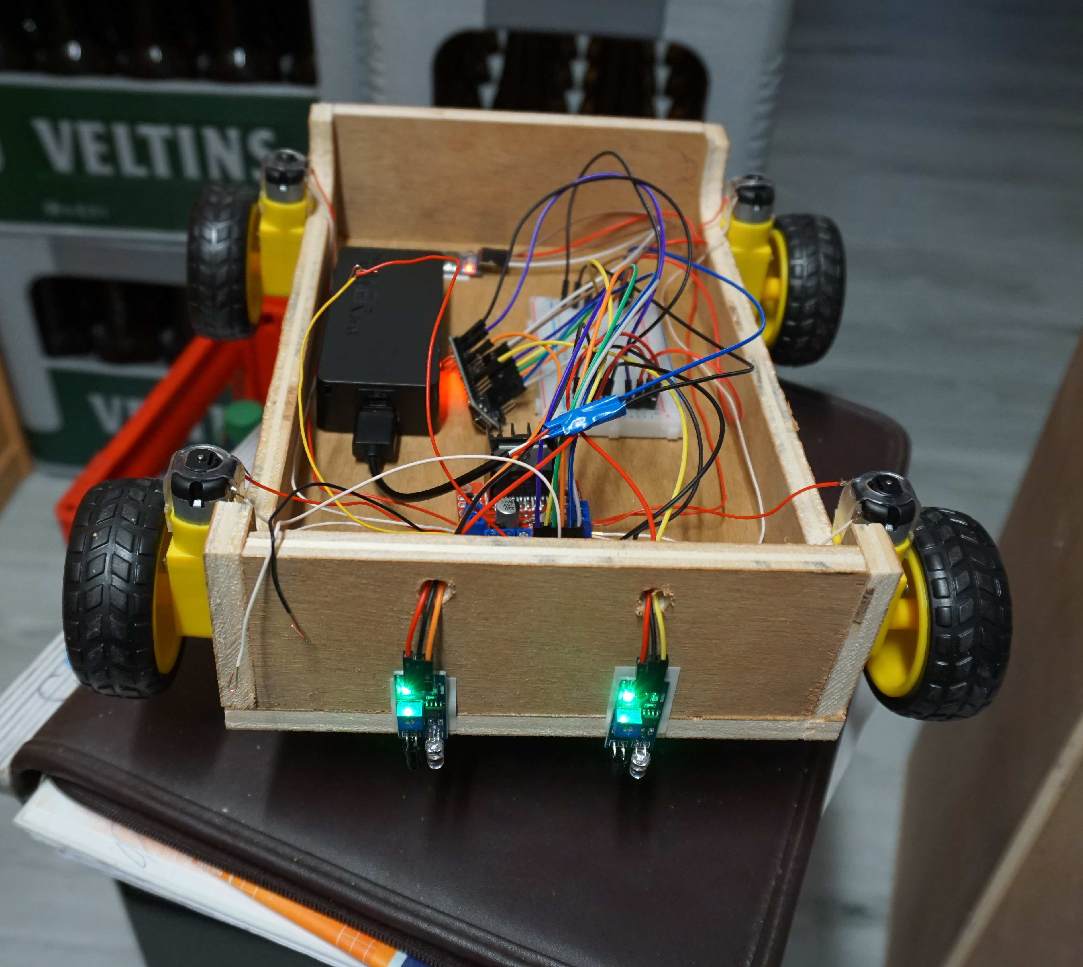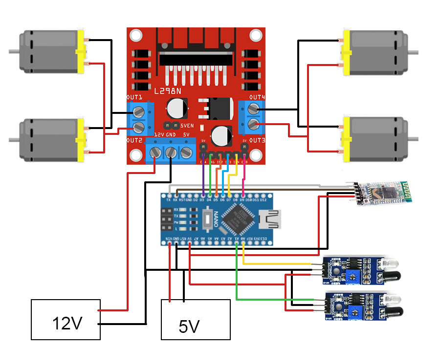 Bei der fertigen Verschaltung musste ich ein paar Änderungen tätigen. Bspw. hat eine Powerbank nicht genug Strom liefern können. Daher bliefere ich jetzt die Motoren Seperat mit 12V, den Arduino und die anderen Komponenten mit den 5V von der Powerbank. Zudem kam noch eine weitere Komponente dazu, die ich vorher wohl vergessen habe zu erwähnen. Um den Arduino per Handy ansteuern zu können, habe ich ein HC-05 Bluetooth Modul verbaut. und dafür werde ich dann noch eine Simple App schreiben.